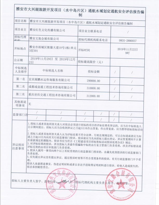 雅安市大興湖旅游開發(fā)項(xiàng)目(水中島片區(qū))通航水域劃定通航安全評估報(bào)告編制單位中標(biāo)公告