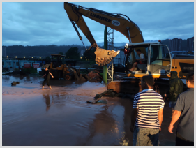 汛情就是命令,險情即是戰(zhàn)場。暴雨面前,項目現(xiàn)場雅安文旅人勇當抗洪一線的逆行者,靠前作戰(zhàn),第一時間組織人員全面排查,投入搶險,全力開展搶險救災工作。一次次冒雨前行,一夜夜通宵搶修,無畏暴風驟雨,現(xiàn)場3臺挖掘機轟隆聲不斷,60余名搶險人員在應急小組領導下緊張而有序的開挖泄洪通道,同時第一時間與下游大唐電站相關負責人取得聯(lián)系,請求啟用片區(qū)3臺泄洪泵。隨著泄洪通道的開挖以及3臺泄洪泵的啟用,現(xiàn)場積水迅速排出,險情得到有效控制。