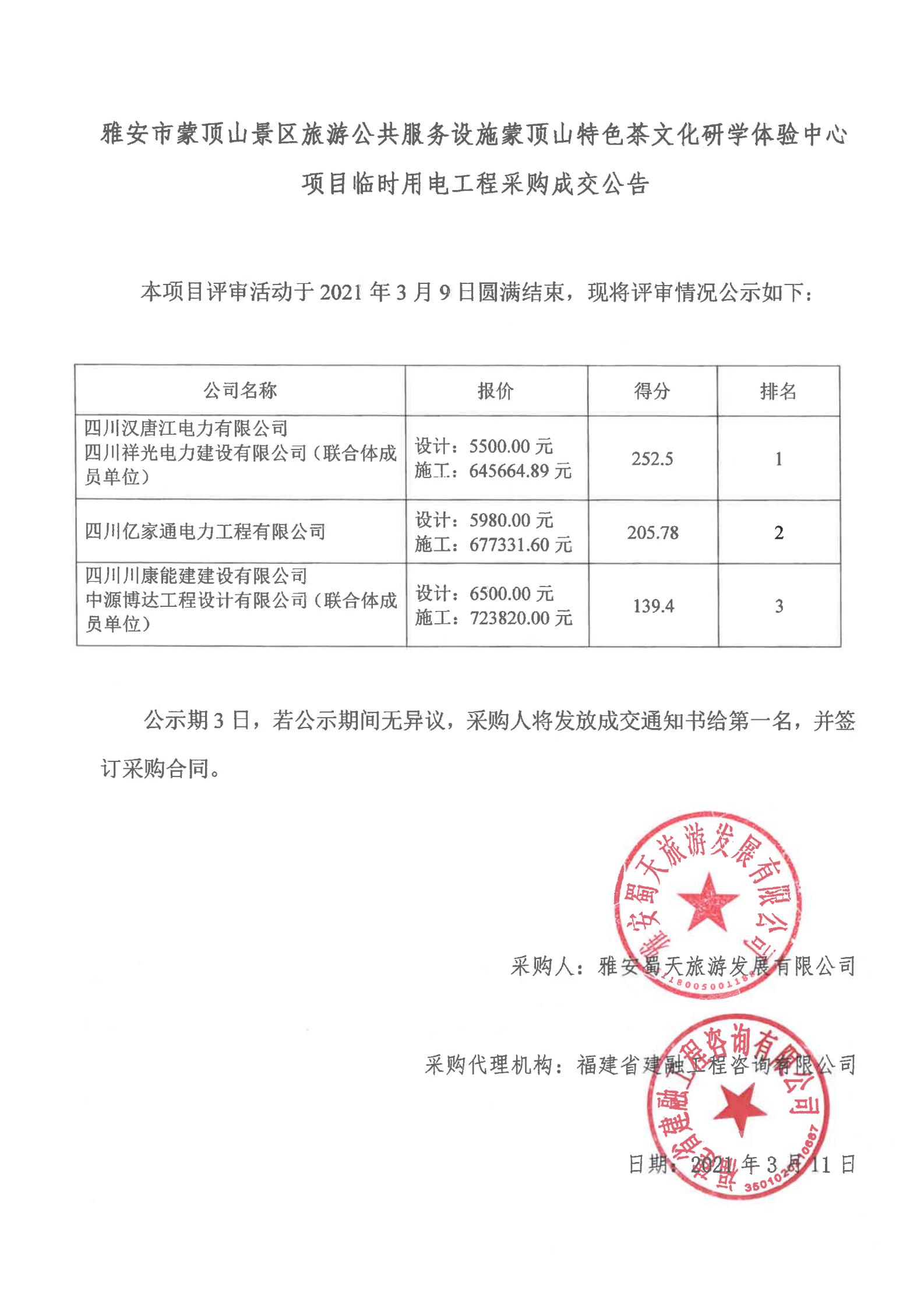 雅安市蒙頂山景區(qū)旅游公共服務(wù)設(shè)施蒙頂山特色茶文化研學(xué)體驗(yàn)中心項(xiàng)目臨時(shí)用電工程采購(gòu)成交公告