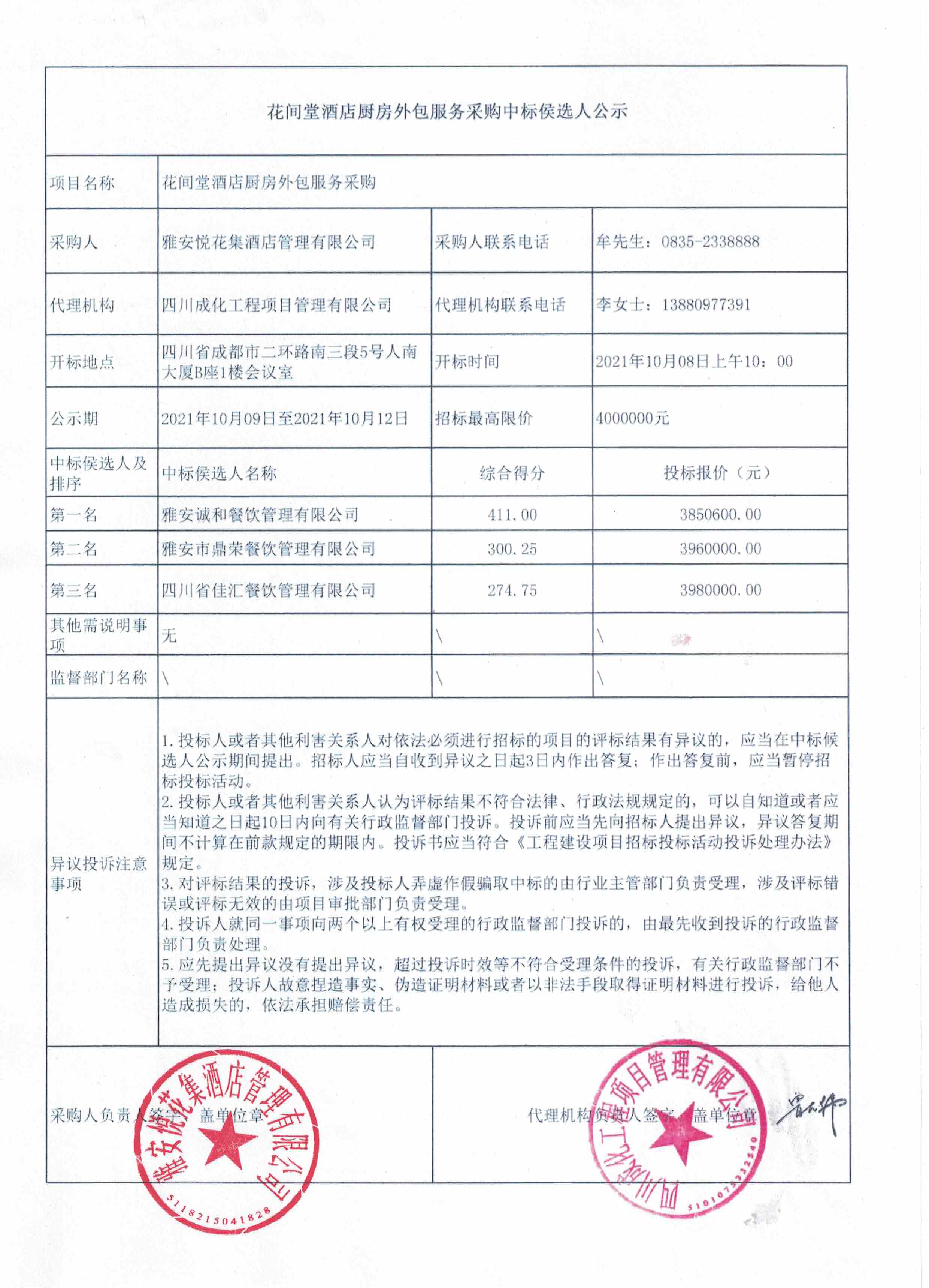 花間堂酒店廚房外包服務采購中標候選人公示