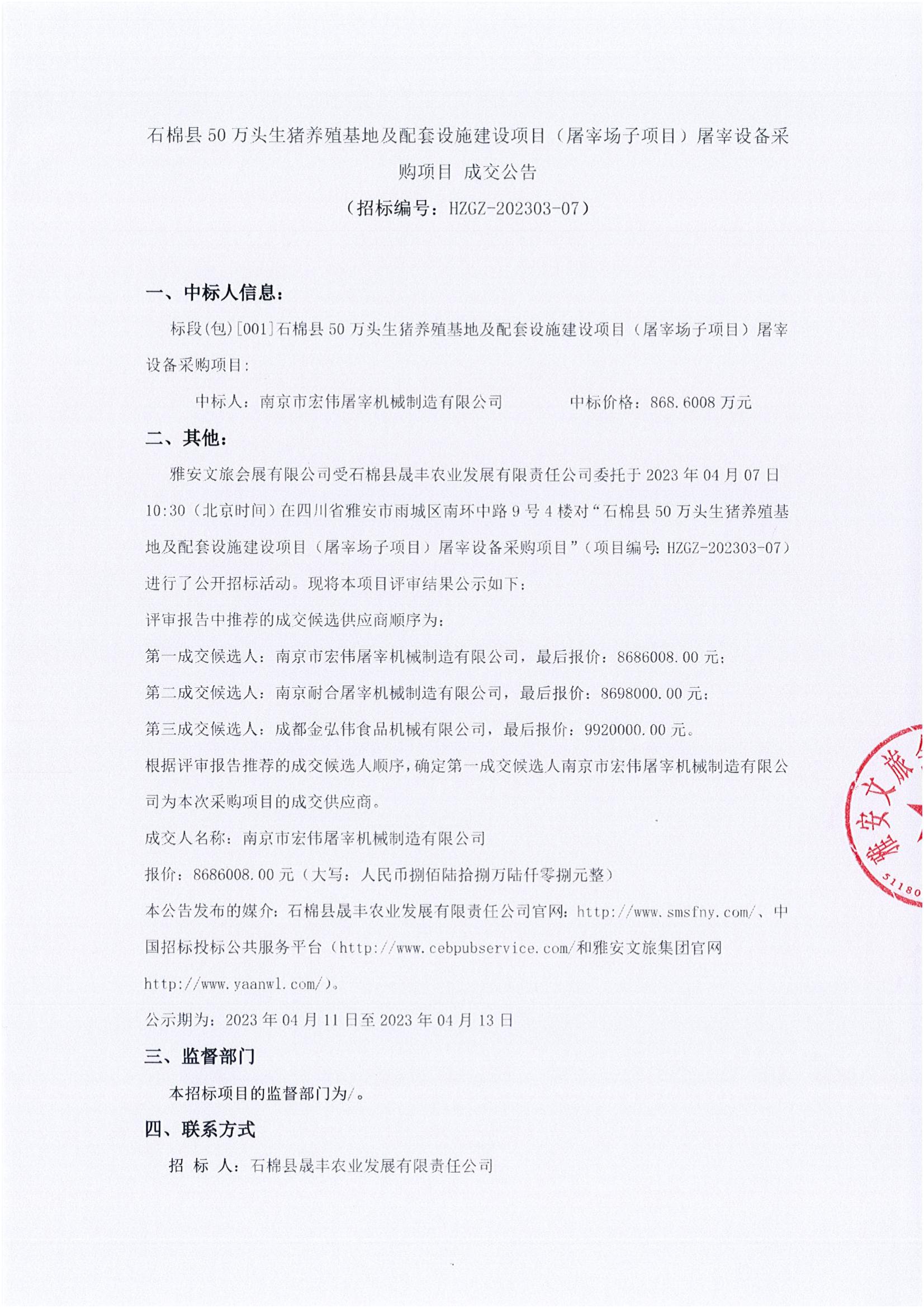 石棉縣50萬頭生豬養(yǎng)殖基地及配套設施建設項目(屠宰場子項目)屠宰設備采購項目 成交公告