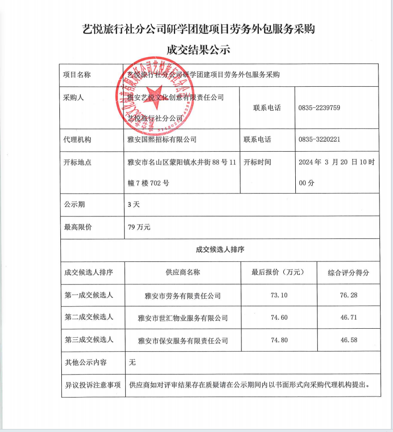 藝悅旅行社分公司研學(xué)團(tuán)建項(xiàng)目勞務(wù)外包服務(wù)采購成交結(jié)果公示